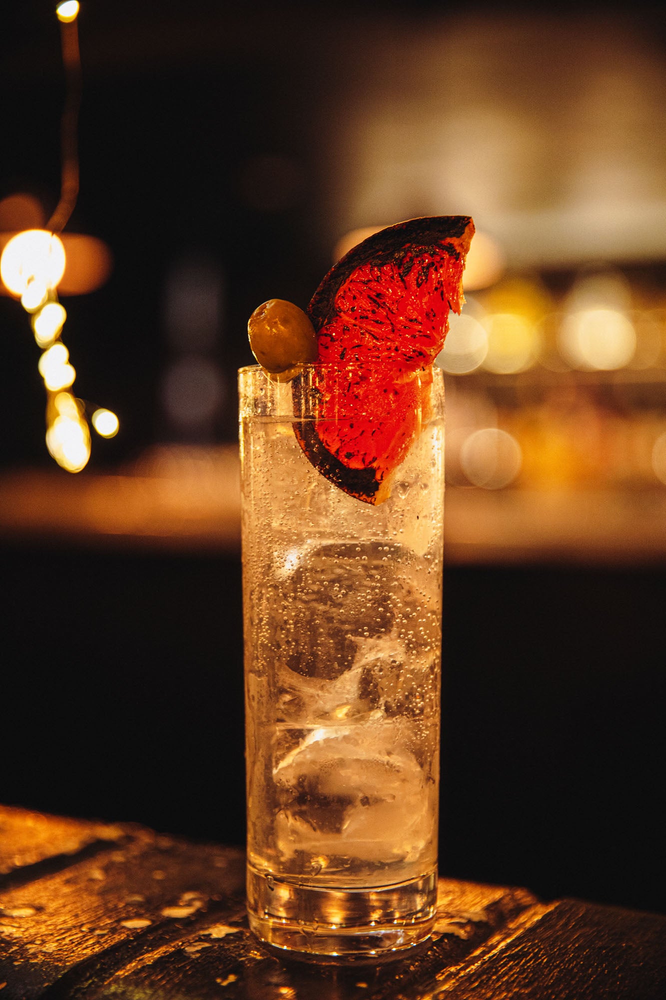 Add all ingredients in glass, apart from the tonic water. Add ice, then tonic, then char grapefruit and add olive